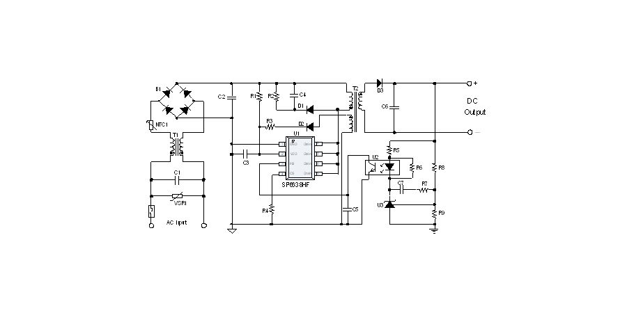 SP6638HF是一顆電流模式PWM控制芯片,內(nèi)置功率MOSFET,用于功率在18W以內(nèi)的方案。該芯片在系統(tǒng)輸出空載時工作在跳頻模式,在系統(tǒng)輸出輕載到中等負載階段工作在PFM模式,在輸出重載時工作在最大恒定工作頻率。SP6638HF的啟動電流和工作電流設(shè)定的比較小,以此減小待機時的功耗。芯片內(nèi)置有斜坡補償電路,避免次諧波振蕩的發(fā)生,改善系統(tǒng)的穩(wěn)定性。芯片內(nèi)置有前沿消隱時間(Leading-edge blanking time),消除緩沖網(wǎng)絡(luò)中的二極管反向恢復(fù)電流對電路的影響。該芯片帶有抖頻功能,能夠有效改善系統(tǒng)的EMI性能。芯片最低的工作頻率設(shè)置在音頻以上,在工作時可以避免系統(tǒng)產(chǎn)生噪音。SP6638HF內(nèi)置多種保護,包括逐周期限流保護(OCP),過壓保護(OVP),VDD過壓箝位,欠壓保護(UVLO),過溫保護(OTP)等,通過內(nèi)部的圖騰柱驅(qū)動結(jié)構(gòu)可以更好的改善系統(tǒng)的EMI特性和開關(guān)的軟啟動控制。SP6638HF使用SOP8無鉛封裝。