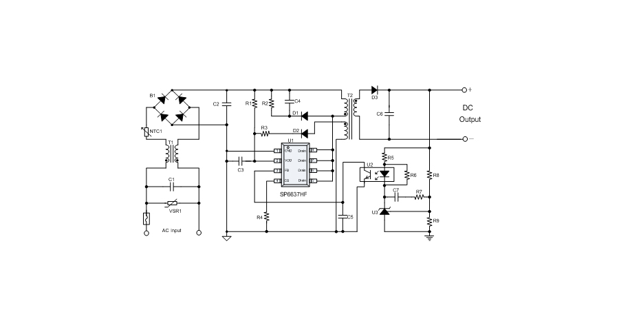 SP6637HF是一顆電流模式PWM控制芯片,內(nèi)置功率MOSFET,用于功率在15W以內(nèi)的方案。該芯片在系統(tǒng)輸出空載時工作在跳頻模式,在系統(tǒng)輸出輕載到中等負(fù)載階段工作在PFM模式,在輸出重載時工作在最大恒定工作頻率。SP6637HF的啟動電流和工作電流設(shè)定的比較小,以此減小待機時的功耗。芯片內(nèi)置有斜坡補償電路,避免次諧波振蕩的發(fā)生,改善系統(tǒng)的穩(wěn)定性。芯片內(nèi)置有前沿消隱時間(Leading-edge blanking time),消除緩沖網(wǎng)絡(luò)中的二極管反向恢復(fù)電流對電路的影響。該芯片帶有抖頻功能,能夠有效改善系統(tǒng)的EMI性能。芯片最低的工作頻率設(shè)置在音頻以上,在工作時可以避免系統(tǒng)產(chǎn)生噪音。SP6637HF內(nèi)置多種保護(hù),包括逐周期限流保護(hù)(OCP),過壓保護(hù)(OVP),VDD過壓箝位,欠壓保護(hù)(UVLO),過溫保護(hù)(OTP)等,通過內(nèi)部的圖騰柱驅(qū)動結(jié)構(gòu)可以更好的改善系統(tǒng)的EMI特性和開關(guān)的軟啟動控制。